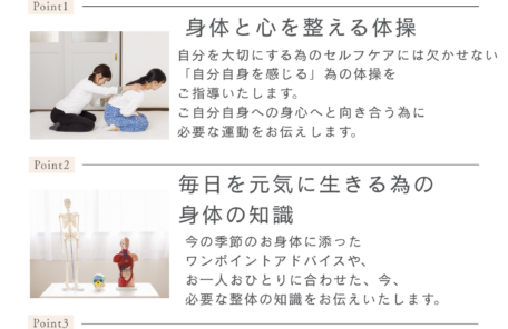 また、最終的にはご自身で心身を整えることが出来るようにアドバイスをさせて頂きます。お一人おひとりに合わせた施術とアドバイスで、末永く、長くお付き合いできる整体院でありたいと考えております。
