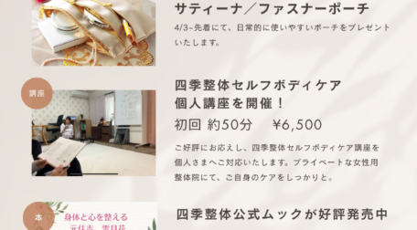 こんにちは。四季整体の古川です。 只今、四季整体の7周年記念開院キャンペーンをおこなっております … 続きを読む 四季整体7周年キャンペーン実施中!